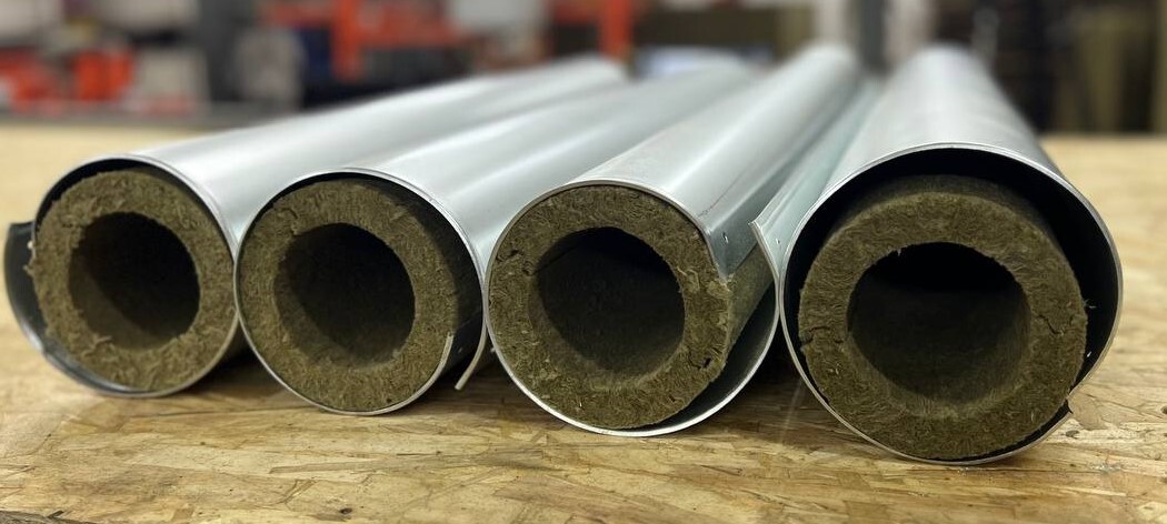 Процесс монтажа : Базальтовый цилиндр в окожушке раскрывается и одевается на трубу, место соединения оцинкованного покрытия фиксируют оцинкованными саморезами.